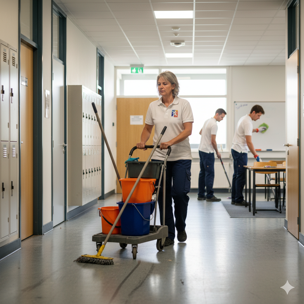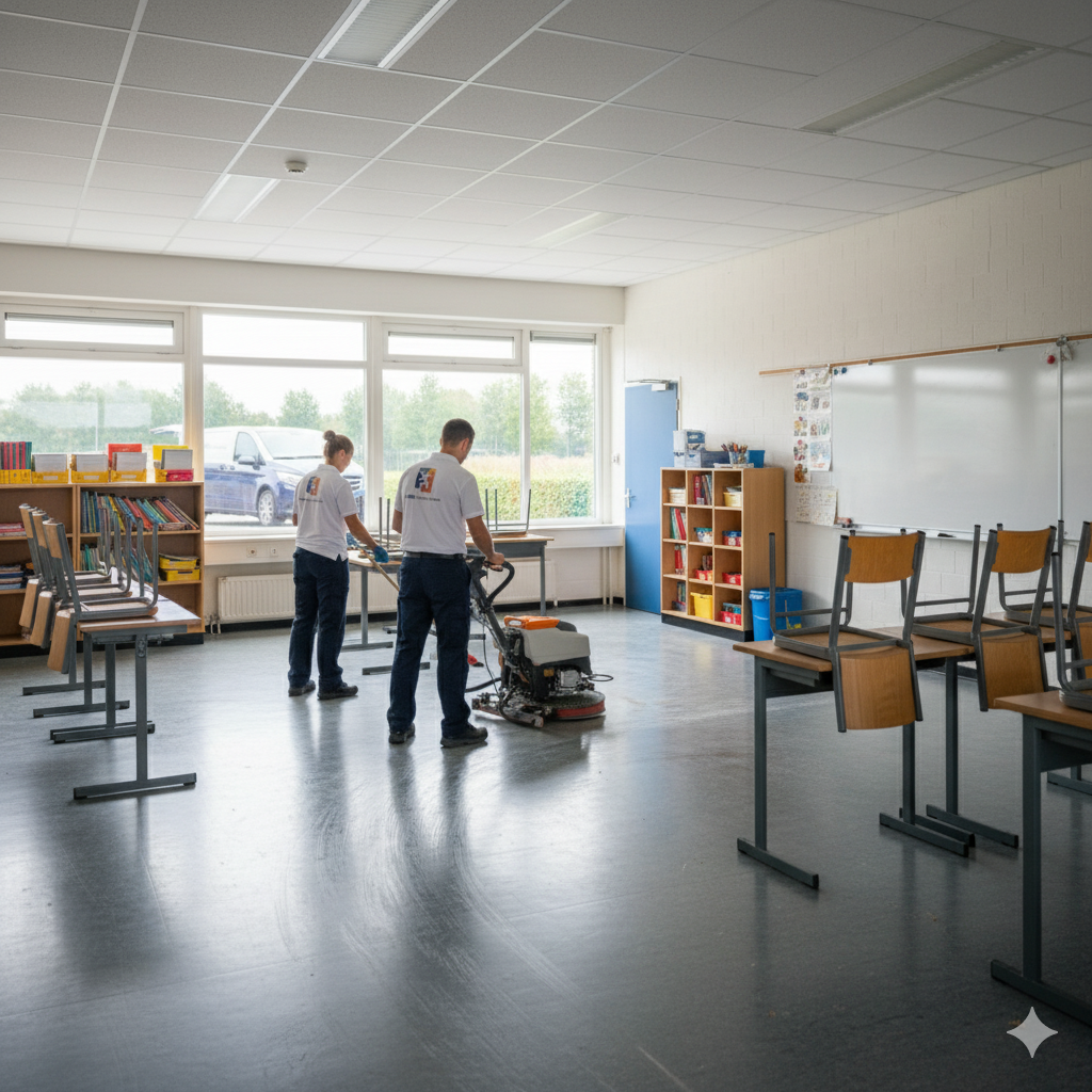- Schoonmaak schoolruimtes: Klaslokalen, aula's, gangen, gymzalen en sanitaire voorzieningen.